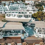 O Manoula'S Beach Mykonos Resort serve um pequeno-almoço gratuito diário. O hotel convida os hóspedes ao lounge bar para relaxar com uma bebida e apreciar as vistas para a piscina. A área do bar inclui salão. Beefbar on the Coast fica a cerca de 500 metros de distância e serve cozinha Europese.